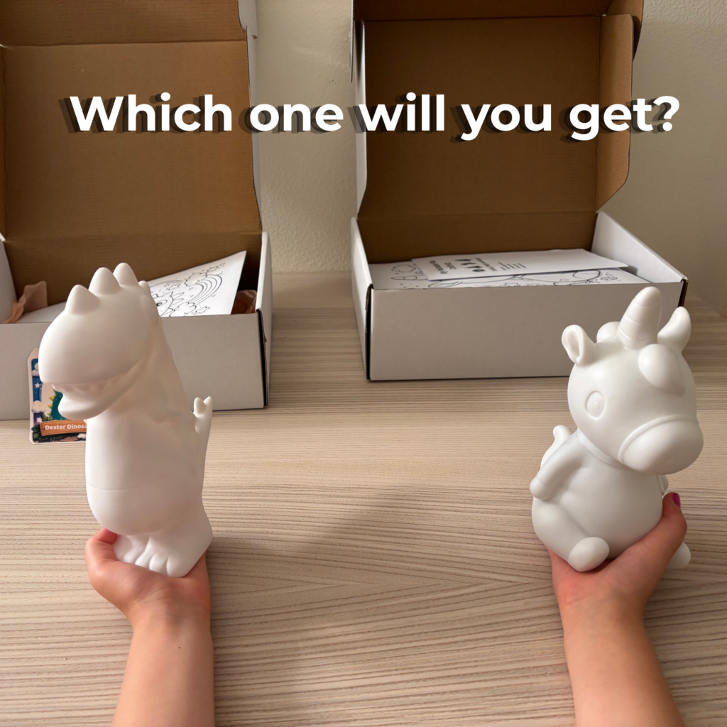 Each Paintable Pal is a cute, shatter-resistant piggy bank designed to hold your coins while showcasing your artistic flair. With adorable character designs and a smooth acrylic surface, it’s the perfect canvas for creativity. Characters include Dexter Dinosaurs, Ulysses Unicorns, Ella Elephants, Bubbles, Bunny, Kiko Kitsune (9-tailed fox) & more.